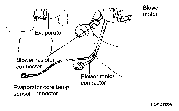 8. Disconnect the evaporator core temp sensor (thermistor), blower resistor connector, and blower motor connector.