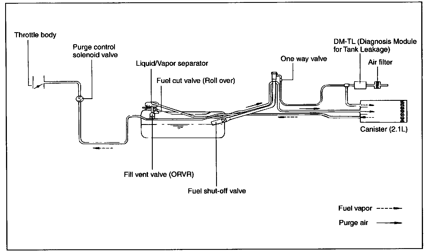 This system consists of fill vent valve (ORVR), fuel shut-off valve, fuel cut valve (roll over), fuel liquid/vapor separator which is installed on the fuel tank, charcoal canister which is mounted under the rear floor LH side member with protector, tubes and miscellaneous connection.