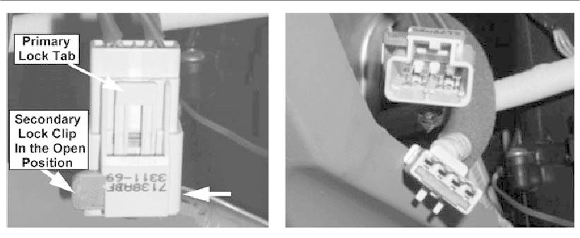 The PAB connector has a special red sliding secondary lock mechanism. To remove the connector, push the red locking clip to the left side (as shown in photo). After the secondary lock has been unfastened, the connector can be released completely by pushing down on the primary lock tab and separating the connector halves.