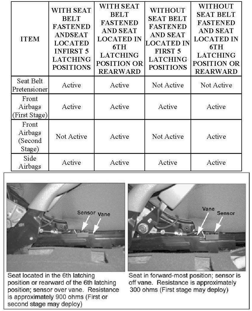 In the event of a frontal impact severe enough to deploy the airbags, if one of the front seats is placed within 5 latching positions from the forward-most position (STPS off of the vane), only the first stage circuit will be activated for that airbag. If the front seat is placed 6 latching positions or more rearward of the forward-most position (STPS over the vane), then the SRS Control Module will deploy the airbag with either the first or second stage circuit (depending on the seat belt usage and the severity of the impact).