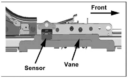 The Seat Track Position Sensor (STPS) is located on the inside seat rail of both front seats. The STPS resistance changes depending on its location relative to a vane mounted on the seat rail. When the STPS is positioned over the vane (6 latching positions or more rearward of the forward-most position), its resistance is approximately 900 ohms. When it is positioned off of the vane (within 5 latching positions from the forward-most position), the sensor's resistance is approximately 300 ohms. (The STPS resistance values are measured without requiring power to the circuit).