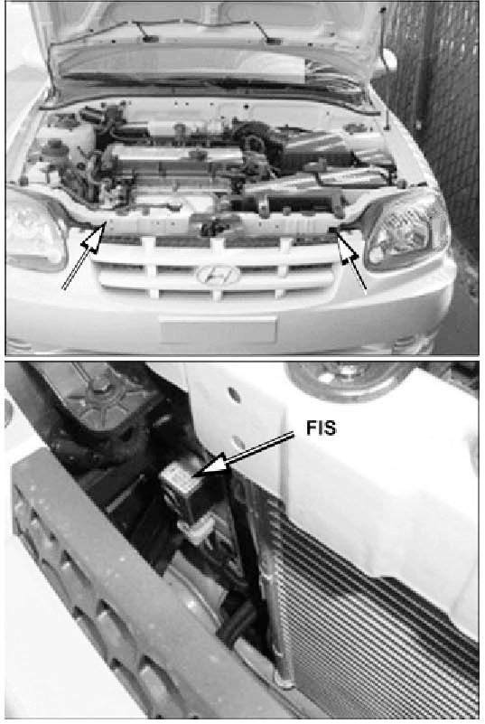 Two front impact sensors are mounted on the radiator support panel on both sides of the radiator. The purpose of the FIS is to aid in the airbag deployment decision.
