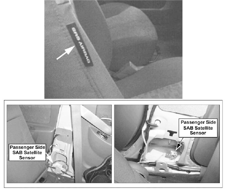 The side impact airbags (installed in both driver and passenger front seats) are the single output type. Side airbag equipped vehicles have "SRS Airbag" imprinted on the side of the front seats. The two satellite sensors are located at the bottom of the B-pillar, behind the seat belt pretensioner assembly.