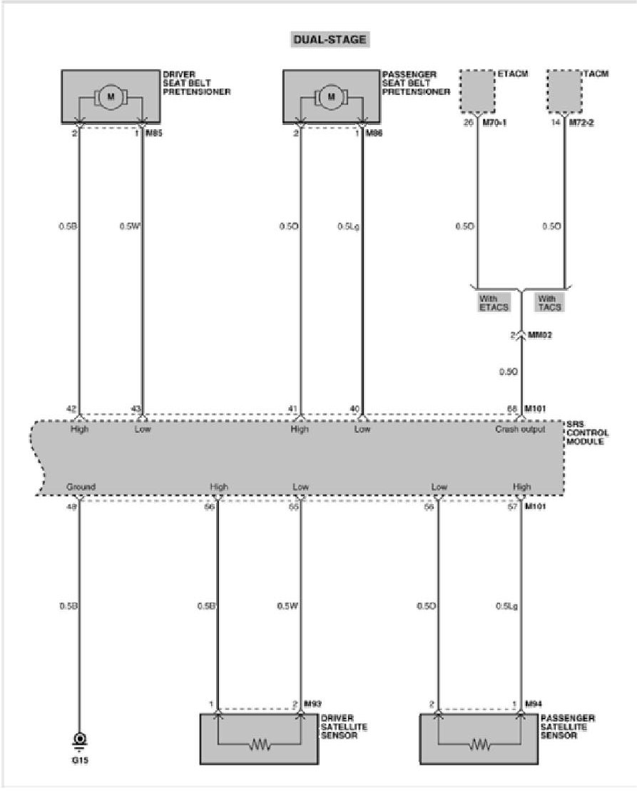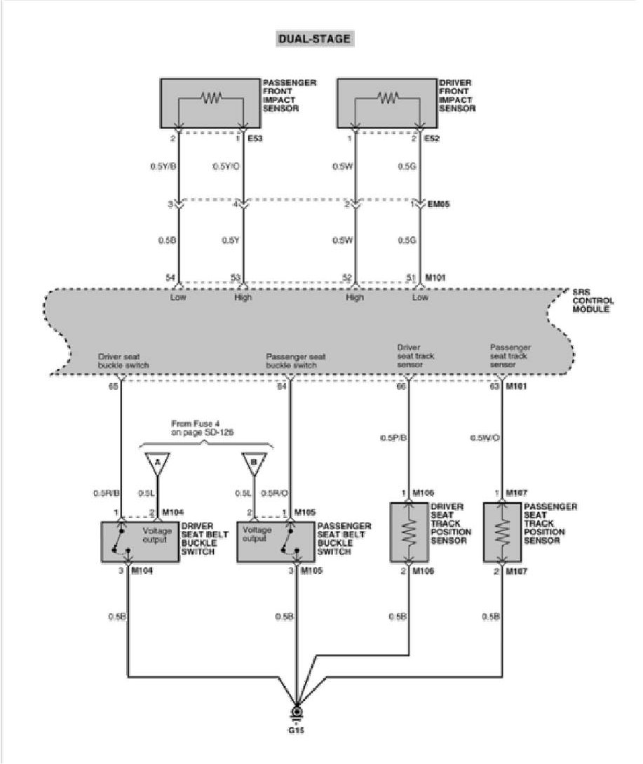 This bulletin provides general information for the Supplemental Restraint System (SRS) that is installed in 2003-2004 MY Accents produced beginning in January, 2003. The dual-stage front airbags provide two levels of inflation. A first stage inflation is provided for moderate impacts, while a second stage inflation is provided for more severe impacts.