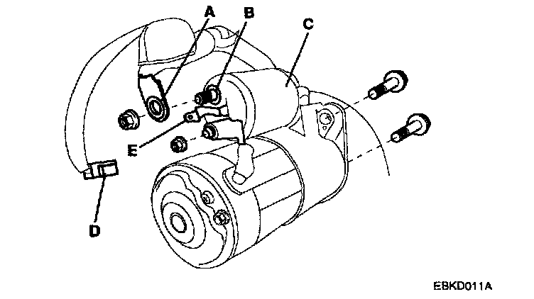 2. Disconnect the starter cable(A) from the B terminal(B) on the solenoid(C), then disconnect the connector (D) from the S terminal(E).