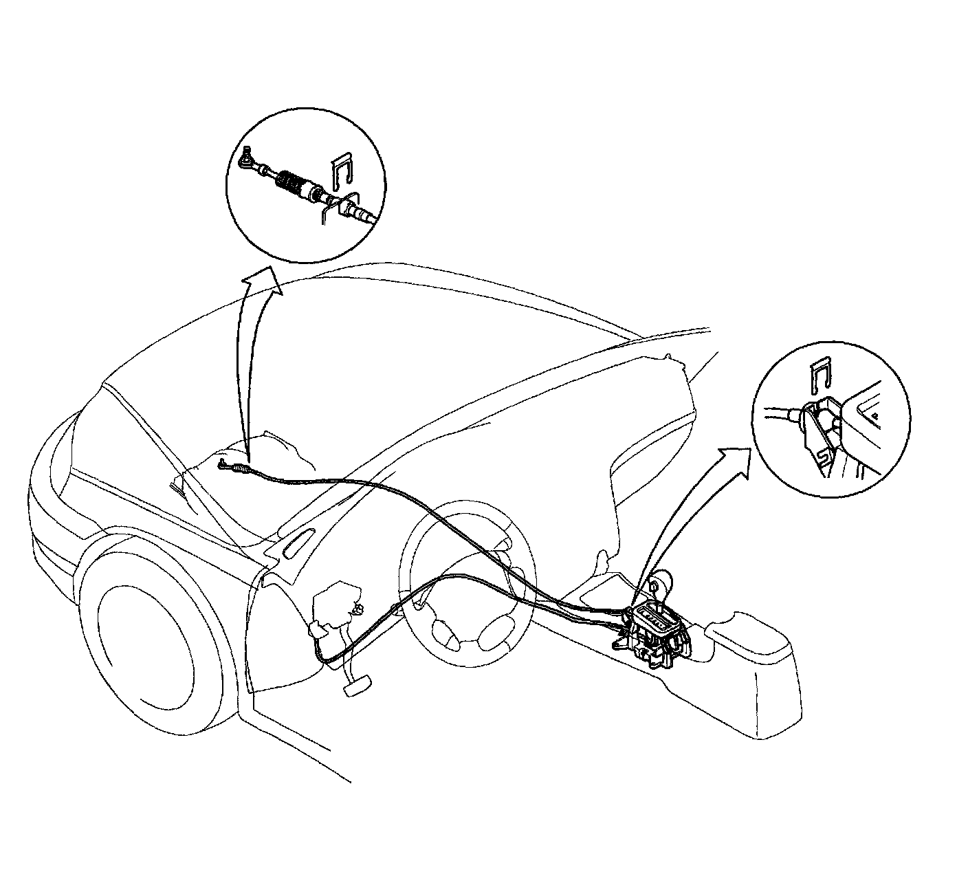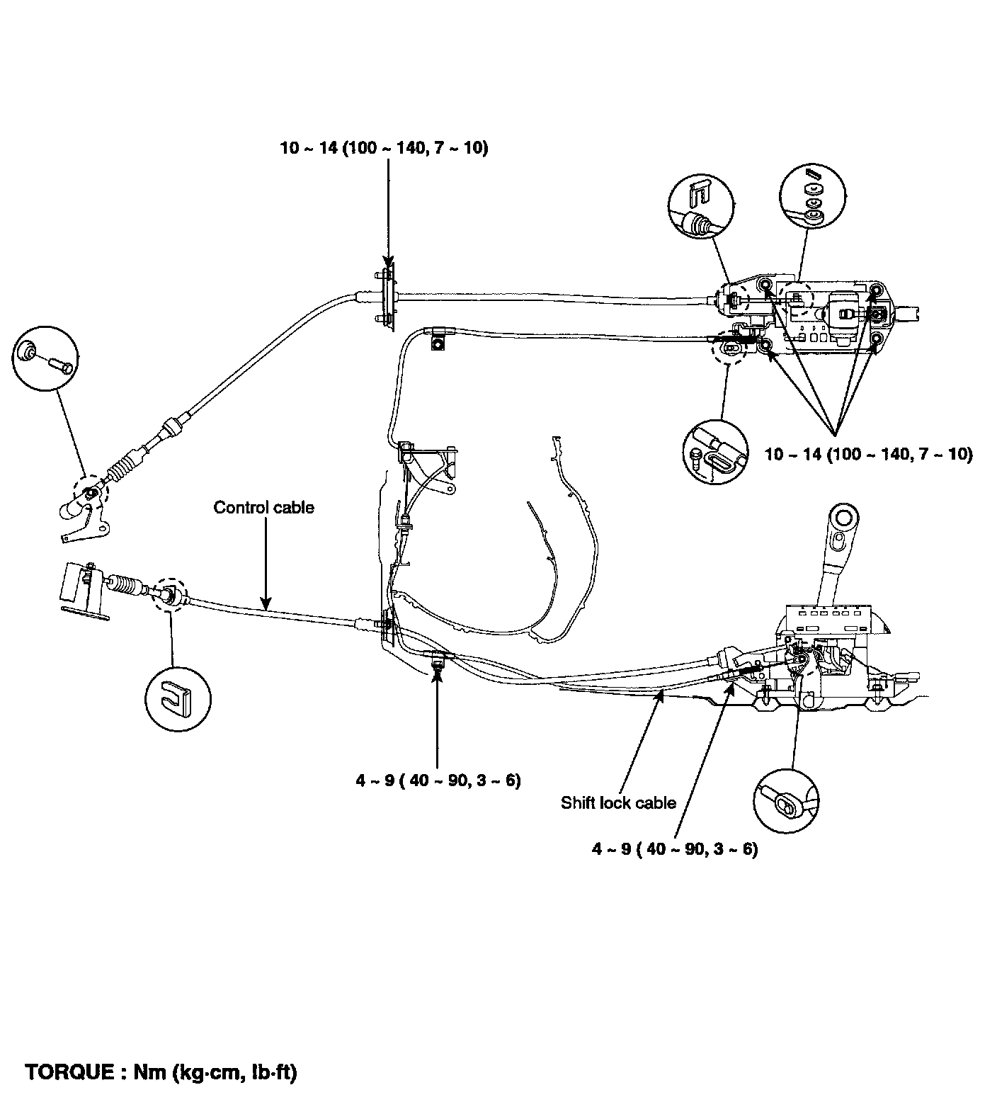 2. Install the shift lock cable and key lock cable in position. In this case' the key lock cable must be fixed to the key cylinder and the shift lock cable must be fixed to the brake pedal in position.