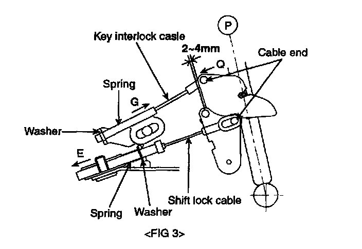 1. Keep the gap of 2-4 mm between the key lock cam and P-lock cam by pulling the shift lock cable in the direction of "E" slightly, and then fix the cable with a nut. After this, be sure to check that the gap is within 2-4 mm.
