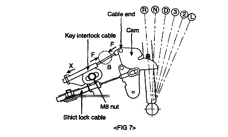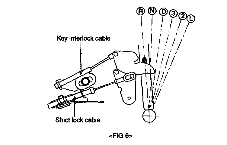 NOTE: If slack in the key lock cable is not eliminated, the ignition key can not be removed from the key cylinder and the shift lever will be able to shift from "P" to other positions, although the key is in the "LOCK" position.