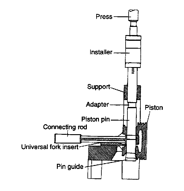 7. Insert the installer tool through the hole in the arch of the support fixture and use an hydraulic press to force the piston pin through the rod little end. Continue pressing until the pin guide falls free and the installer tool seats against the top of the arch.