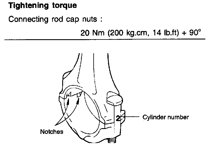 Connecting rod cap nuts: 20 Nm (200 kg.cm, 14 ft. lbs.) + 90°