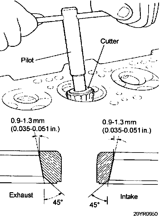 Before reconditioning the seat, check the valve guide for wear. If the valve guide is worn, replace it, and then recondition the seat. Recondition the valve seat with a valve seat grinder or cutter. The valve seat contact width should be within specifications and centered on the valve face.