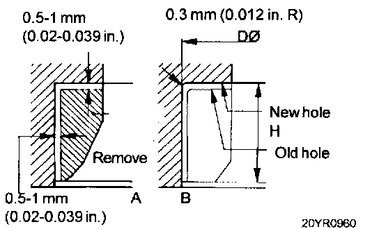 1. Any valve seat insert that has been worn over the service limit should be removed at normal temperature after cutting away most of the insert wall using valve seat cutters as shown in Fig. "A".