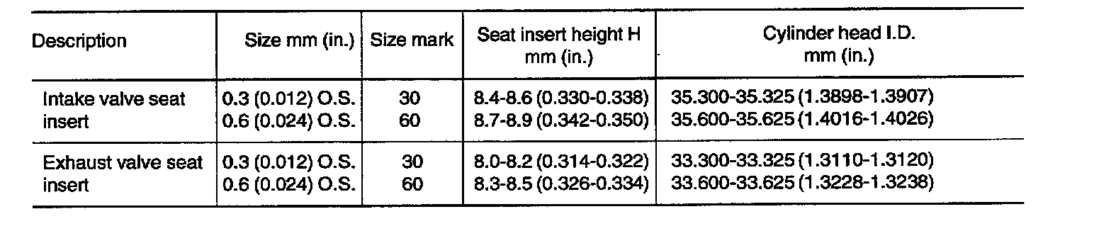 3. Heat the cylinder head to about 250°C (480°F) and press in the oversize seat insert. The oversize seat insert should be at normal room temperature for installation. After installing of a new valve seat insert, resurface the valve seat using the same procedure as in paragraph 1 in Valve Seat Insert.
