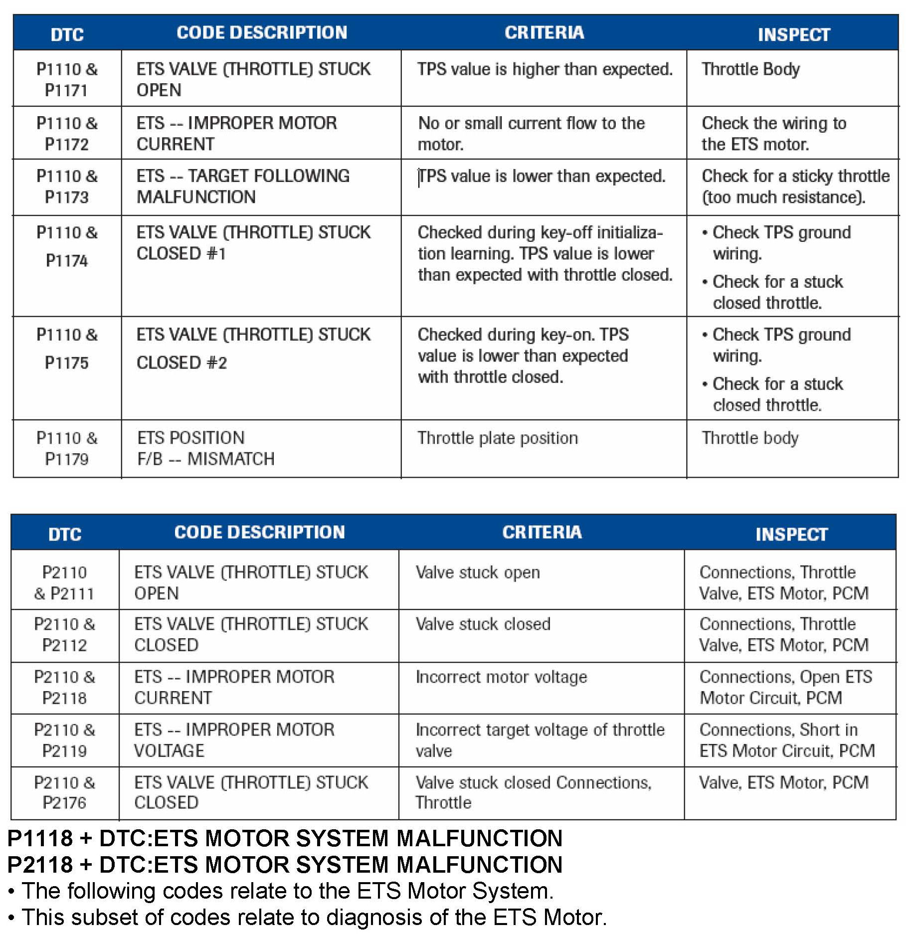 P1118 & P1178. The first code is to signify that the fault is related to the ETS Motor. The second code P1178 signifies that there is an electrical open circuit. Thus the power to the ETS Motor may be interrupted.