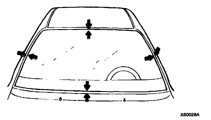 3. Center the new windshield glass in the opening. Mark the location by marking lines across the glass and body with a grease pencil at the four points as shown.