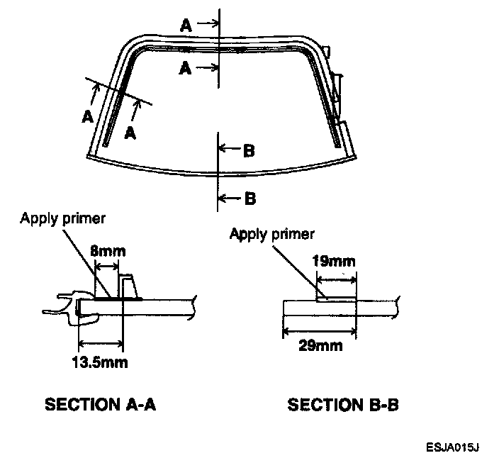 9. Apply a light coat of body primer to the original sealant remaining around the window opening flange. The glass should be installed within 10 minutes after you apply the primer.