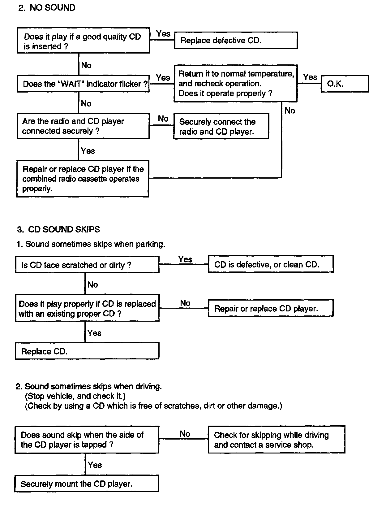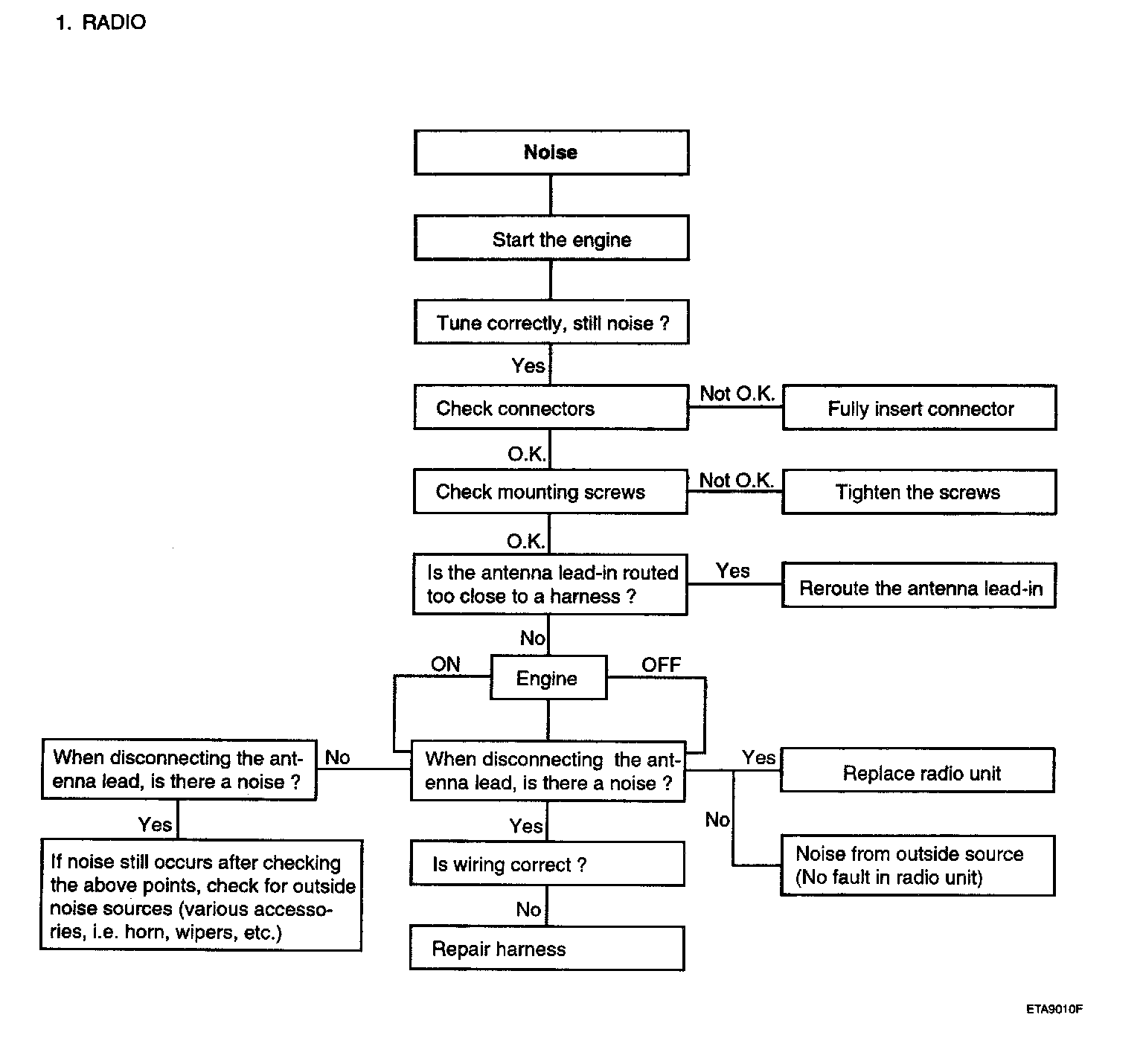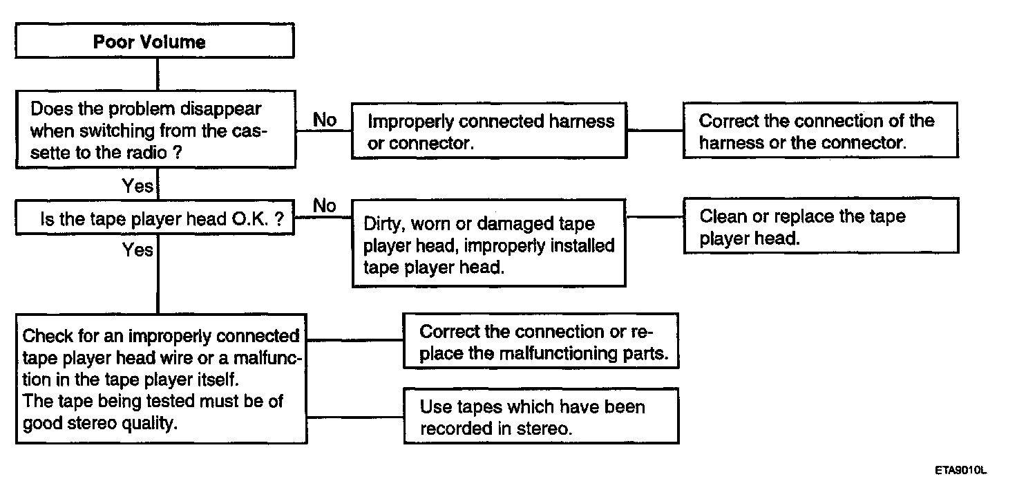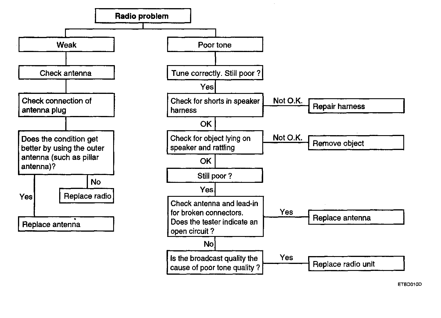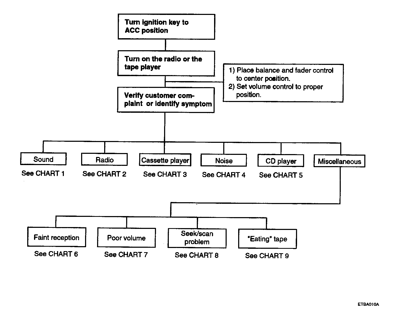 AUDIOThere are six areas where a problem can occur: wiring harness, the radio, the cassette tape deck, the CD player, the speaker, and antenna. Troubleshooting enables you to confine the problem to a particular area.