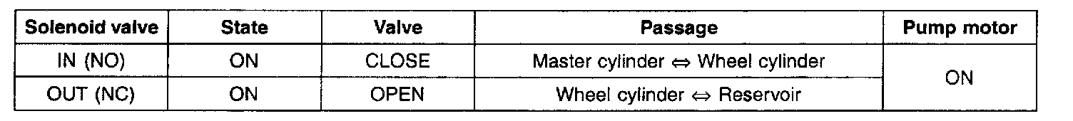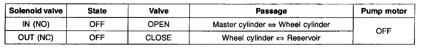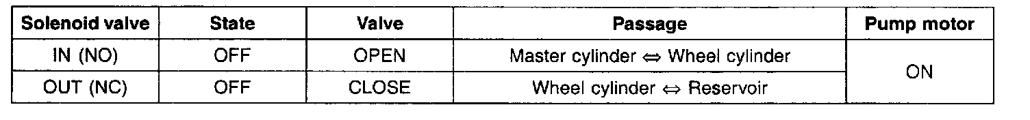 If HECU determines there's no lock-up in the wheel, HECU cuts voltage to solenoid valve. So voltage is not supplied to each solenoid valve, brake fluid passes through the inlet valve to wheel cylinder, resulting in pressure increase.