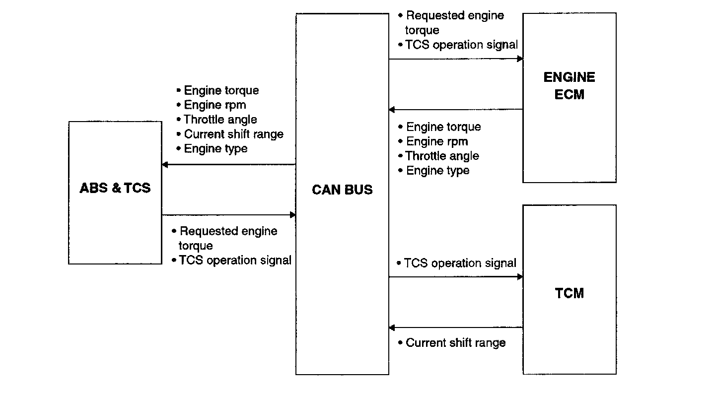 4. HECU will transmit engine torque reduction request, fuel cut cylinder number, and TCS control request signals in accordance with slip level to engine ECM and TCM through BUS line which will provide CAN communication for TCS control.