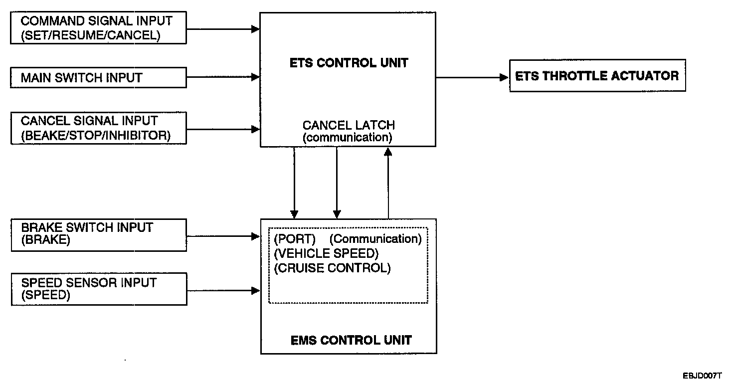 The auto cruise control has built-in ETS. (Electronic Throttle System) ETS control module and ECM (Engine Control Module) receive sensor signal input (for instance, command switch signal, brake switch signal, speed sensor signal, etc.) and control the operation of the ETS throttle actuator.