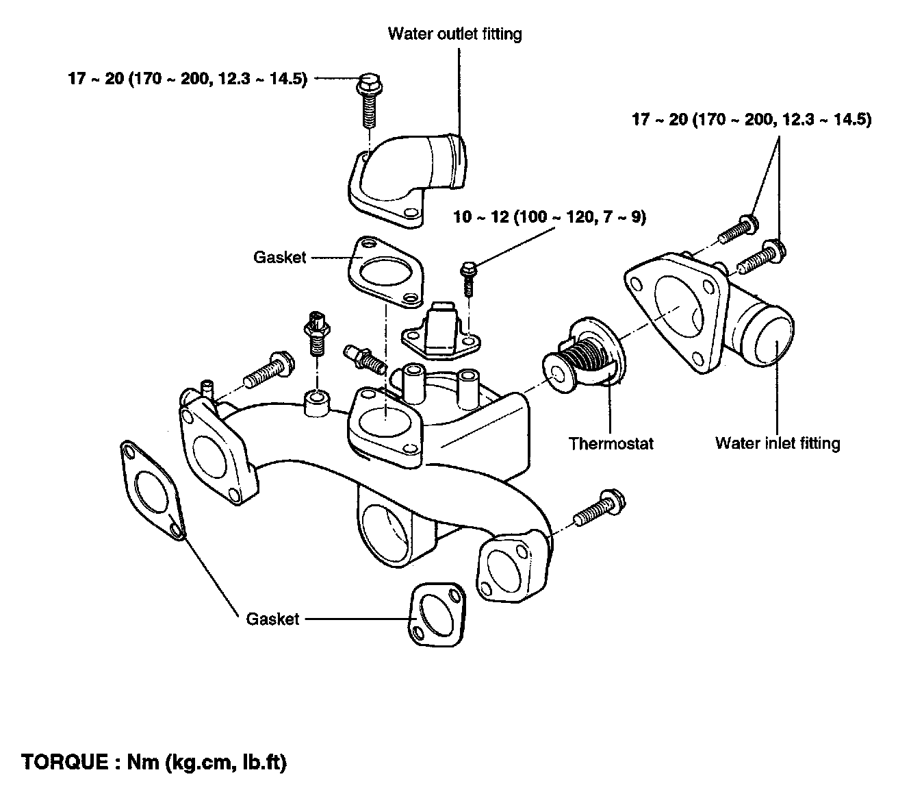 Engine coolant inlet fitting bolt: 17 - 20 Nm (170 - 200 kgf-cm, 12 - 14 ft. lbs.)
