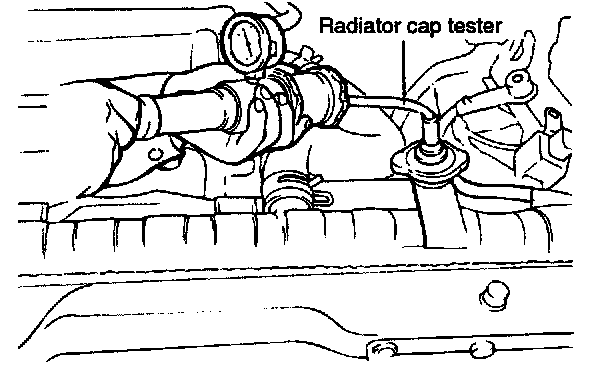 3. Install a radiator cap tester to the radiator filler neck and apply 150 kPa (21 psi, 1.53 kgf/cm2) pressure. Hold for two minutes, then check for leakage from the radiator, hoses or connections.