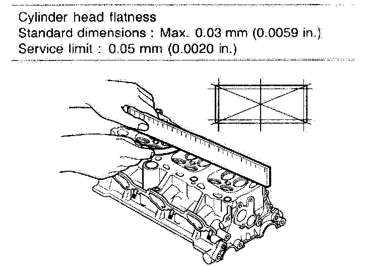 3. Check the cylinder head surface for flatness with a straight edge and feeler gauge as shown in the illustration.