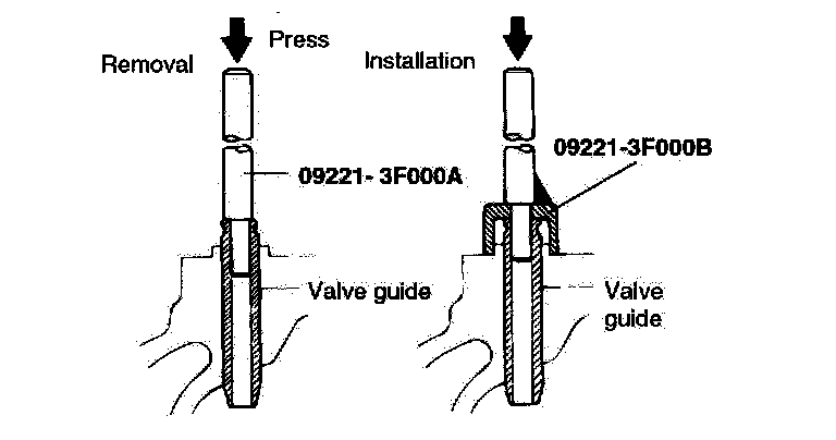 3. Using the special tool (09221-3F000 A/B) press-fit the valve guide. The valve guide must be press-fitted from the upper side of the cylinder head. Keep in mind that the intake and exhaust valve guides are different in length.