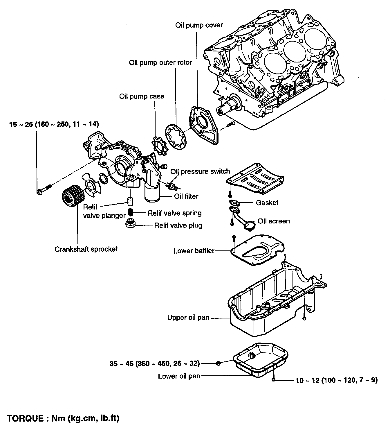 Oil screen bolt: 15 - 22 Nm (150 - 220 kgf-cm, 11 - 15 ft. lbs.)