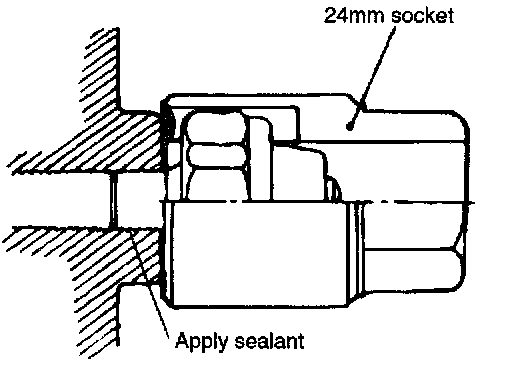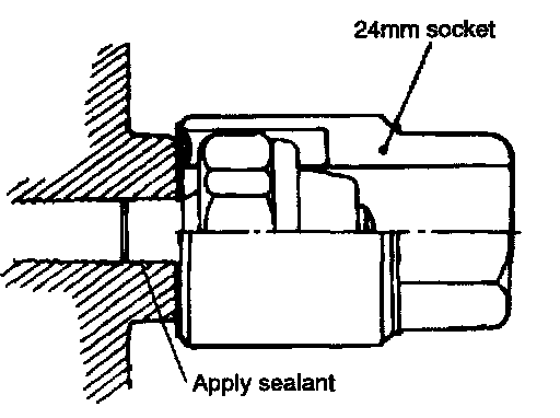 9. Using a 24 mm deep socket, install the oil pressure switch after applying sealant to the threaded area.