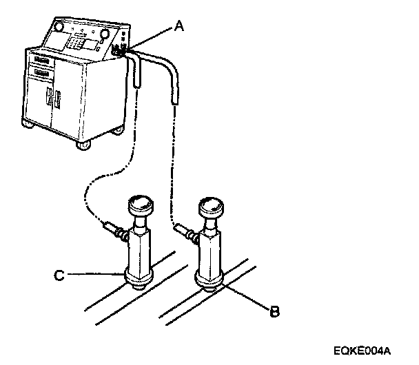 1. Connect a R-134a refrigerant recovery/recycling/charging station(A) to the high-pressure service port(B) and the low-pressure service port(C), as shown, following the equipment manufacturer's instruction.
