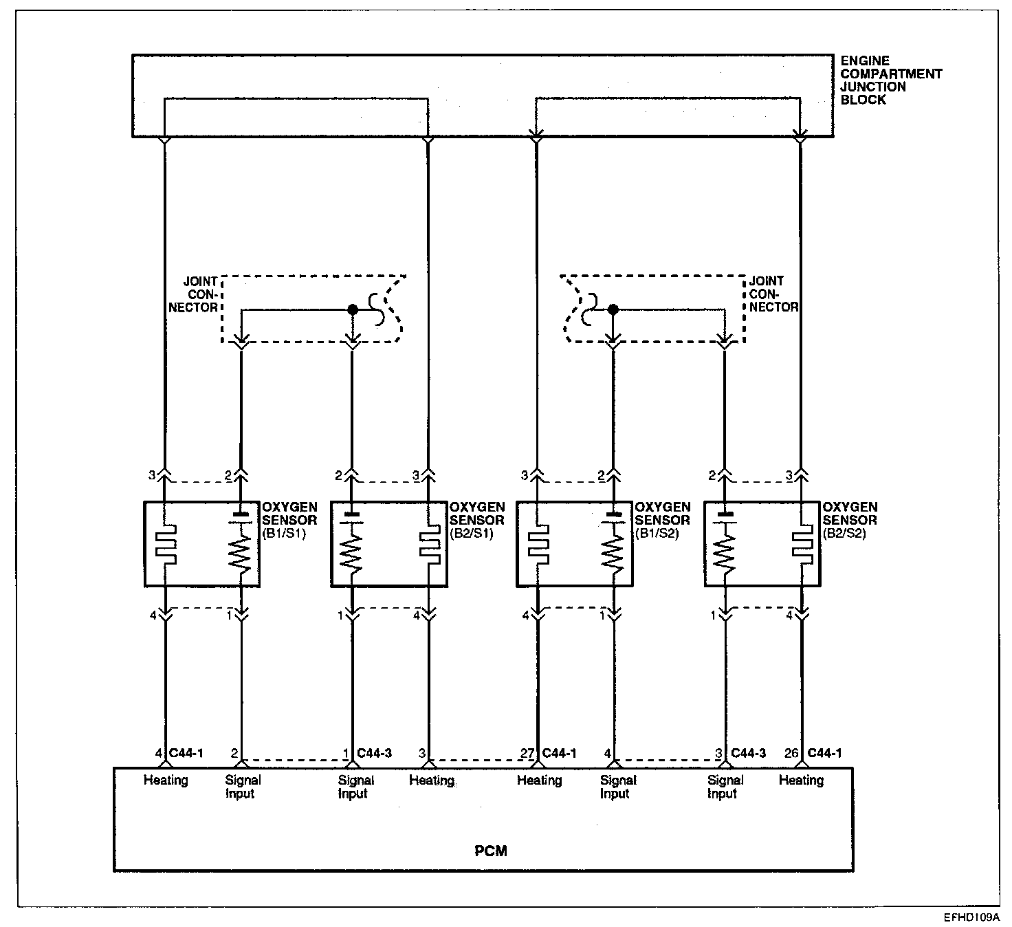 HEATED OXYGEN SENSOR (HO2S)The heated oxygen sensor senses the oxygen concentration in exhaust gas and converts it into a voltage which is sent to the PCM. For Zirconium type sensors, the oxygen sensor outputs about 1 V when the air fuel ratio is richer than the theoretical ratio, and outputs about 0 V when the ratio is leaner (higher oxygen concentration in exhaust gas.). The PCM controls the fuel injection ratio based on this signal so that the air fuel ratio is maintained at the stoichiometric ratio. The oxygen sensor has a heating element which ensures sensor performance during all driving conditions.