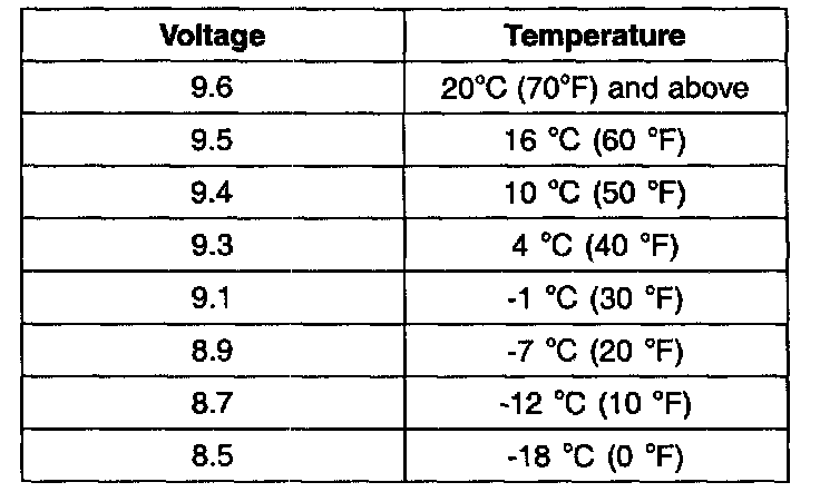e. Compare the voltage reading with the minimum and replace the battery if battery test voltage is below that shown in the voltage table.