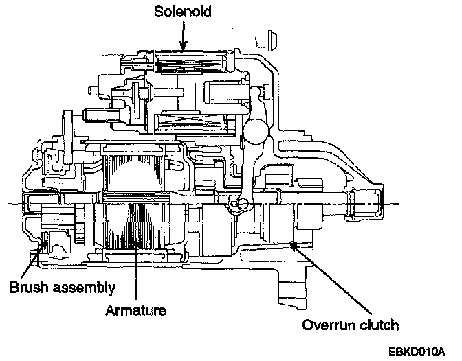 The contacts close and the starter motor cranks. In order to prevent damage caused by excessive rotation of the starter armature when the engine starts, the clutch pinion gear overruns.