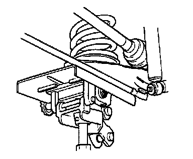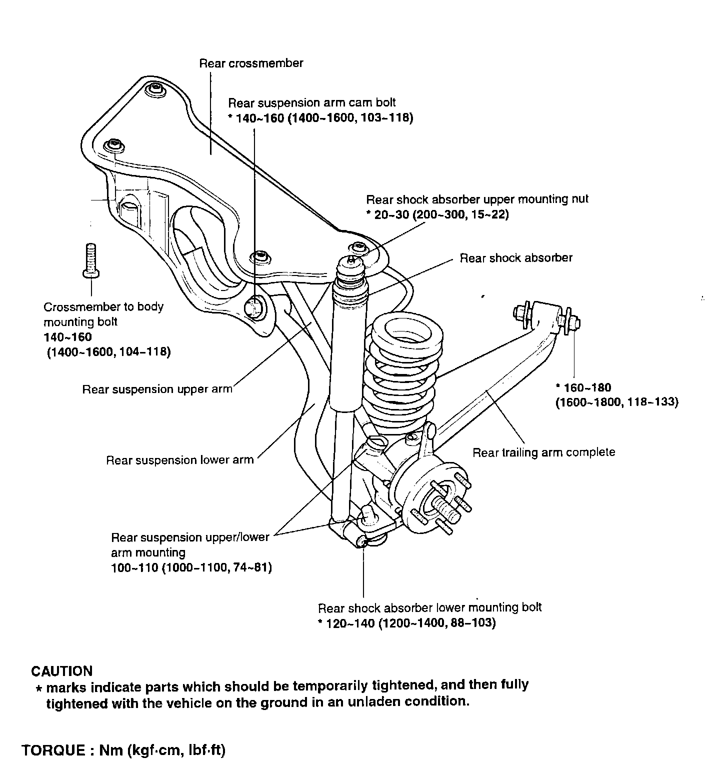 ^ When the rear shock absorber is removed, remove the rear shock absorber mounting bolt. Support the trailing arm with a jack.