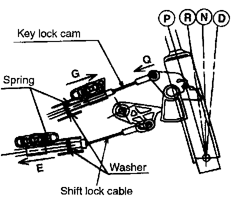1. When the brake pedal is not depressed, the push button of the shift lever at "P" position must not be operable. (Shift lever cannot be shifted at the other positions from "P")