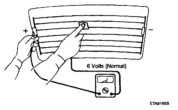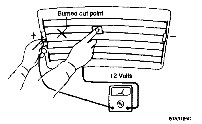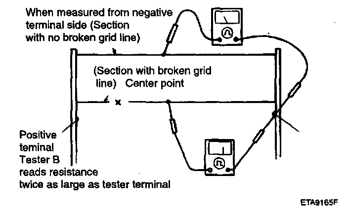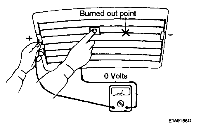5. Use an ohmmeter to measure the resistance of each heater line between a terminal and the center of a grid line, and between the same terminal and the center of one adjacent heater line. The section with a broken heater line will have a resistance twice as that in other sections. In the affected section, move the test lead to a position where the resistance sharply changes.