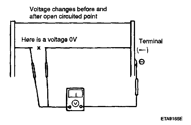 4. To check for open circuits, slowly move the test lead in the direction that the open circuit seems to exist Try to find a point where a voltage is generated or changes to 0 V. The point where the voltage has changed is the open-circuit point.