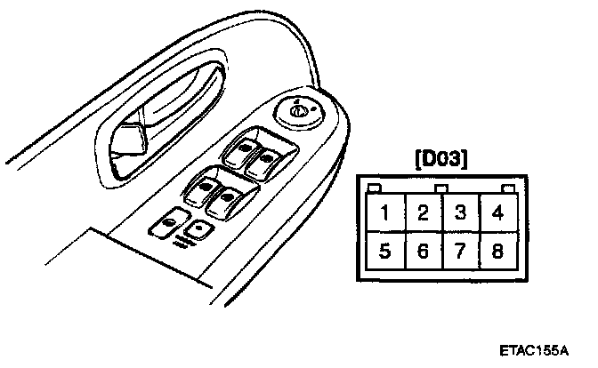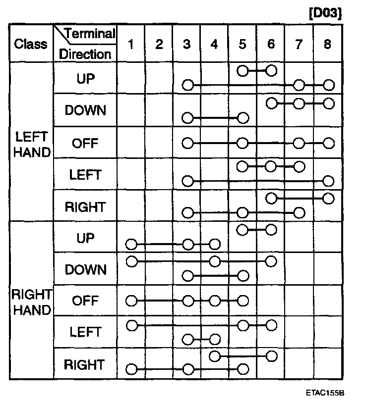 2. Check for continuity between the terminals in each switch position according to the table. If continuity is not as specified, replace the power door mirror switch.