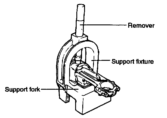 4. To remove the pin from the piston, place the piston in the support fixture with the rod resting on the fork inserts. Pass the remover tool through the top of the support fixture and use it to press out the pin.