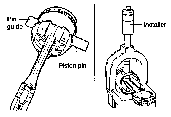 3. Check that the piston pin fits in the piston pin hole. Replace any piston and pin assembly that is defective. The piston pin must be pressed smoothly by hand into the pin hole (at room temperature).