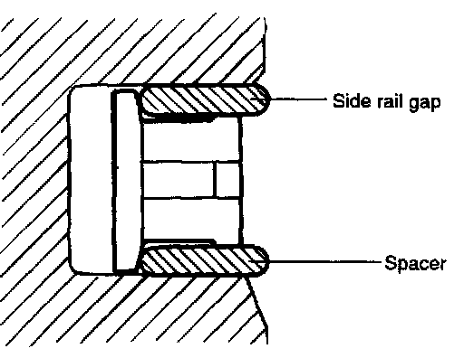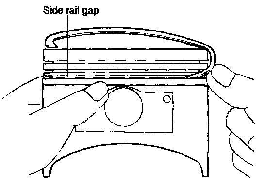 2. Install the upper side rail. To install the side rail, first put one end of the side rail between the piston ring groove and spacer, hold it firmly, and press down with finger on the portion to be inserted into the groove (as illustrated).