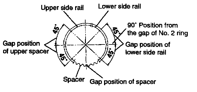 7. Position each piston ring end gap as far away from its neighboring gaps as possible. Make sure that the gaps are not positioned in the thrust and pin directions.