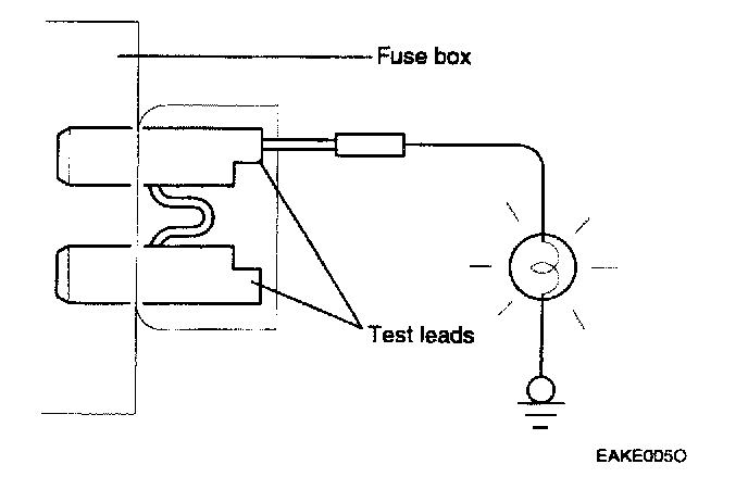 A blade type fuse test leads provided to allow checking the fuse itself without removing it from the fuse box. The fuse is good if the test lamp lights up when one lead is connected to the test leads (one at a time) and the other lead is grounded. (Turn on the ignition switch so that the fuse circuit becomes operative)