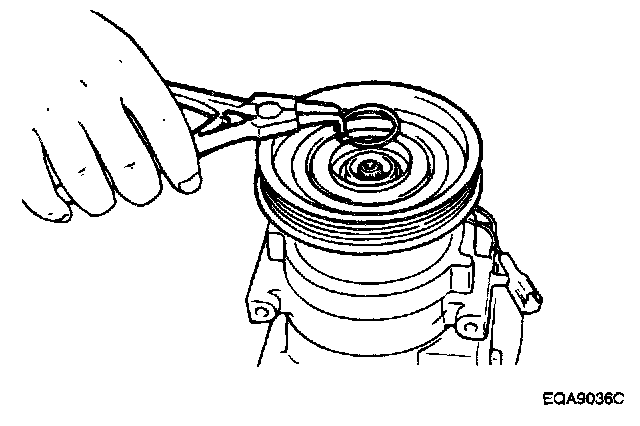 3. Remove the pulley retaining snap ring and then pull the pulley and bearing assembly from the compressor.