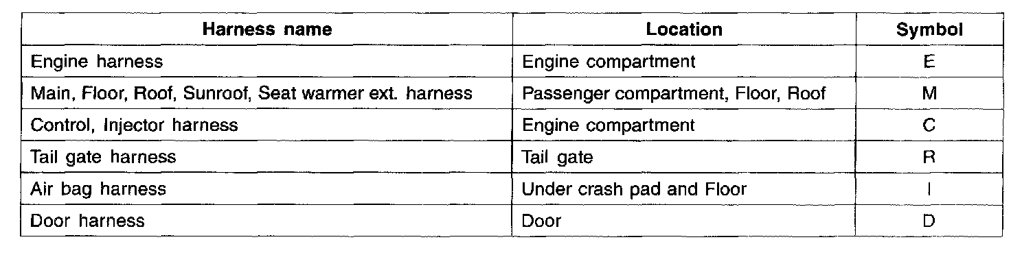 Electrical wiring connectors are classified according to the wiring parts in the Harness Layouts.