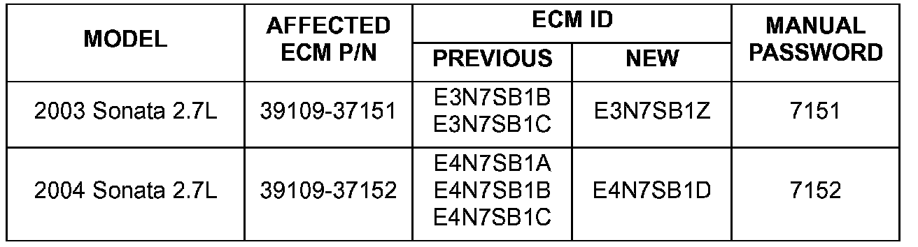 2003-2004 SONATA 2.7L ECM REPROGRAMMING FOR DTC P0133/P0153