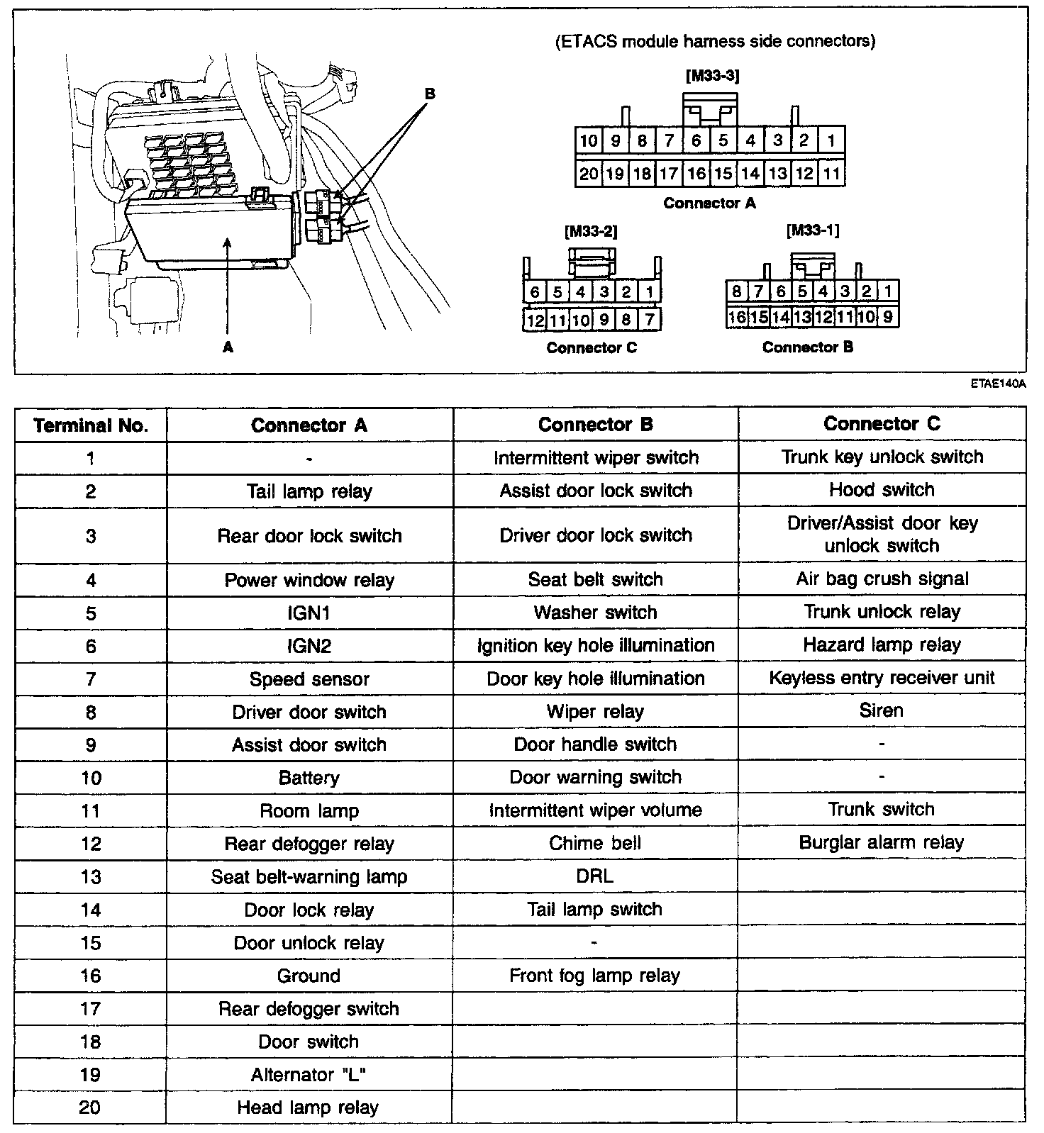 ETACS MODULE INPUT SIGNAL TEST1. Disconnect the wire connectors(B) from the ETACS module(A).