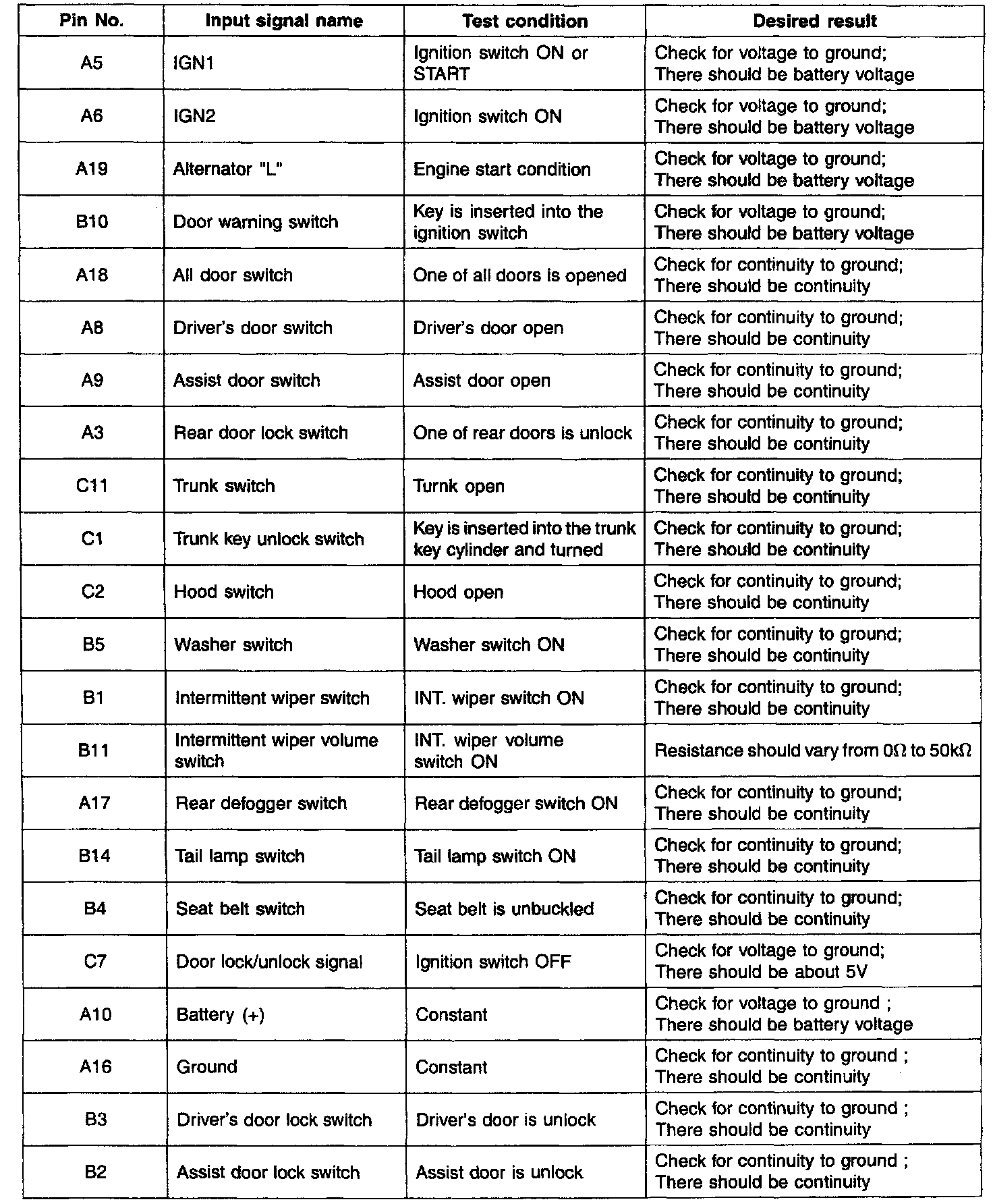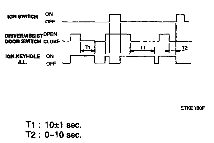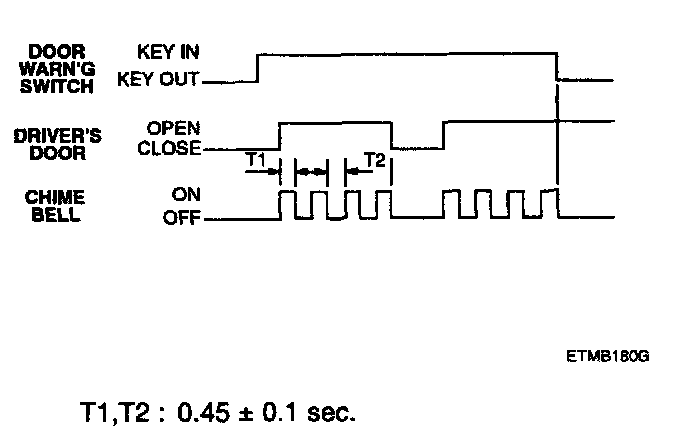 1. If the key is in the ignition key cylinder and the driver's door is opened, the chime bell sounds continually (period: 0.9 sec. Duty rate:50%).