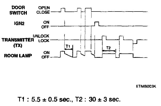 5. With keyless UNLOCK, when the door is closed, the room lamp is turned ON, then OFF after about 30 seconds. While the room lamp is ON due to keyless UNLOCK, if another UNLOCK is received, the room lamp is again ON for 30 seconds